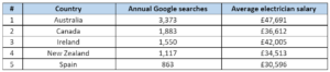 For those looking to move, Australia appears to be the most coveted destination. Every year, Brits search for electrical jobs abroad more than 18,000 times, and the land down under tops the wishlist, with an average of 3,373 Google searches.